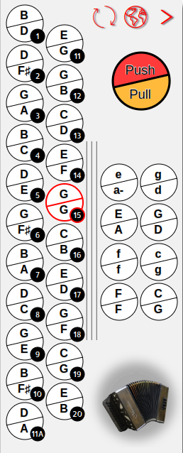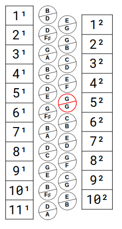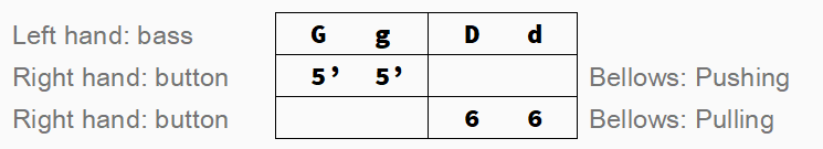 In the first, pushing the bellows, the "G bass" note (G) is played while, simultaneously, the button 5 of the inner row (notice the apostrophe) is pressed. Next, the "G major" chord (g) is played, still pushing the bellows, along with button 5 on the inner row.