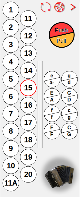 The second and third rows display the buttons played with the right hand, where the second row shows which buttons should be pressed while pushing the bellows and the third row shows the buttons pressed when pulling the bellows.
